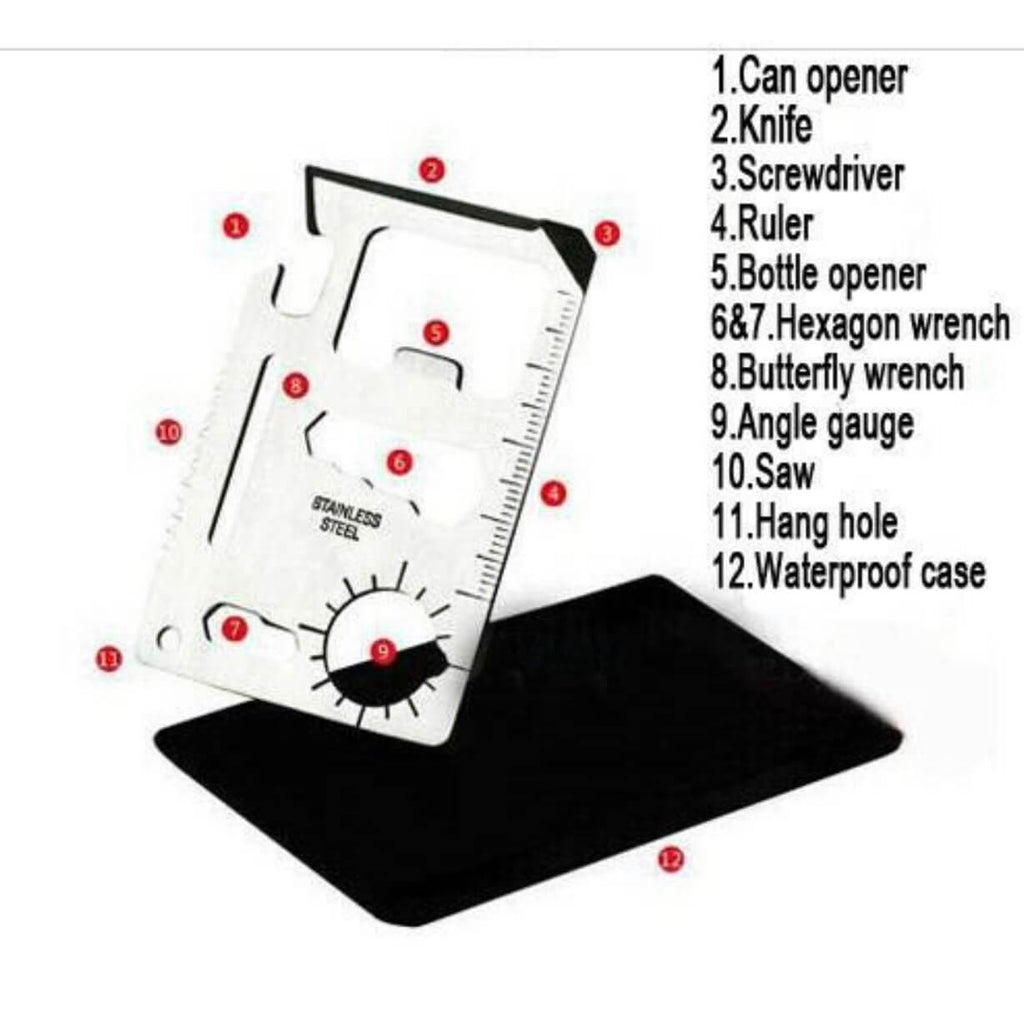 This EDC Multitool is the same size as a credit card and can easily be added to your wallet. It also includes a black carrying pouch. Great Everyday Carry tool. Ideal for keeping in your car, truck, boat, tackle box, atv, office desk, first aid or survival kit, and anywhere else you can think of.