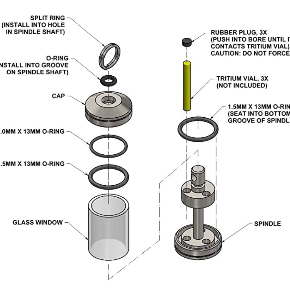 Install the 3 tritium vials (not supplied) in each of the 3 bores. Make sure each vial is seated into the holes at the bottom of the spindle.
